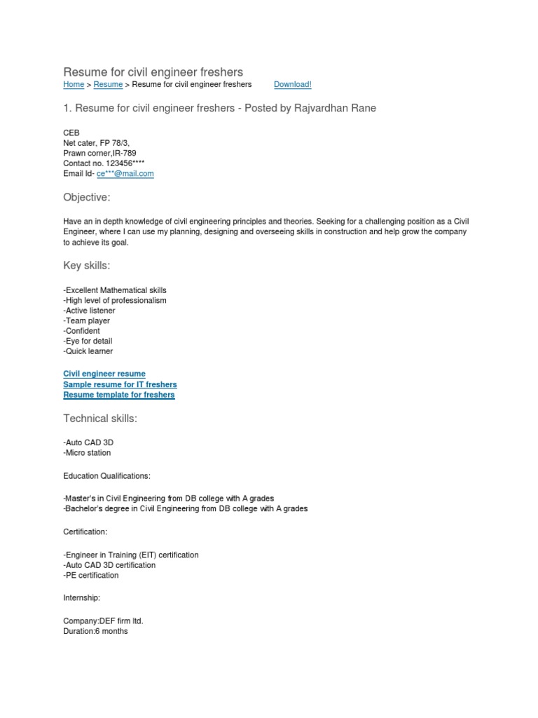 My maturity, practical experience and diligence will surely be an asset to your institution. Civil engineer fresher looking for site engineer job, internship at hcc, 5.96. Civil engineer punjab, dumpy level, compression testing machine, b.tech. Civil engineer fresher resume format doc. Objective seeking for a challenging position as a civil engineer, where i can use my planning, designing and overseeing skills in construction and help grow the company to.